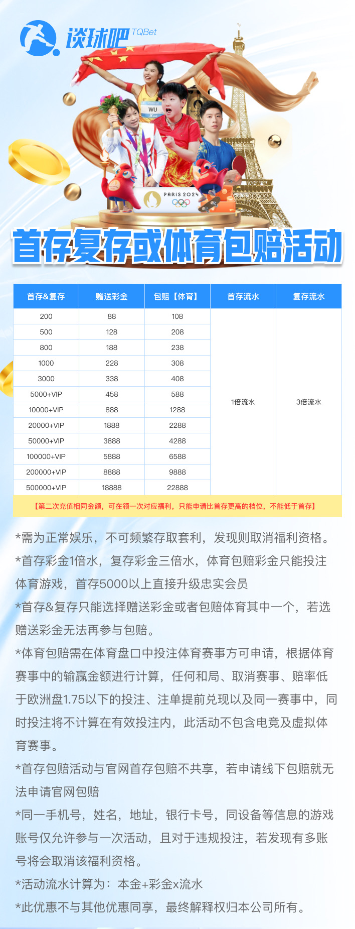 3、首存&复存只能选择赠送彩金或者包赔体育其中一个,若选赠送彩金无法再参与包赔。
