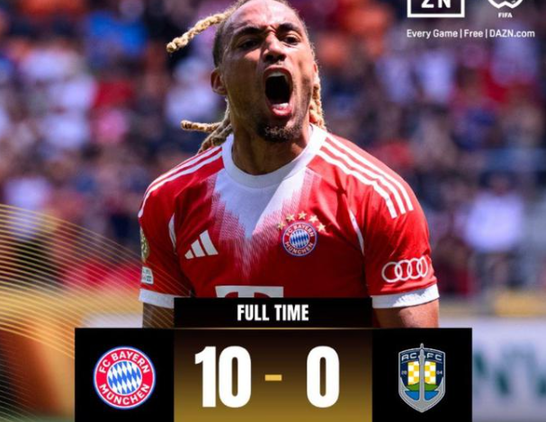 上半场结束,拜仁已经6-0领先。下半场,拜仁依旧没有收手,再进4球。比分最终定格在让人尴尬的10-0。此役,穆西亚拉替补出场后上演帽子戏法,而科曼、穆勒、奥利赛分别打进2球。