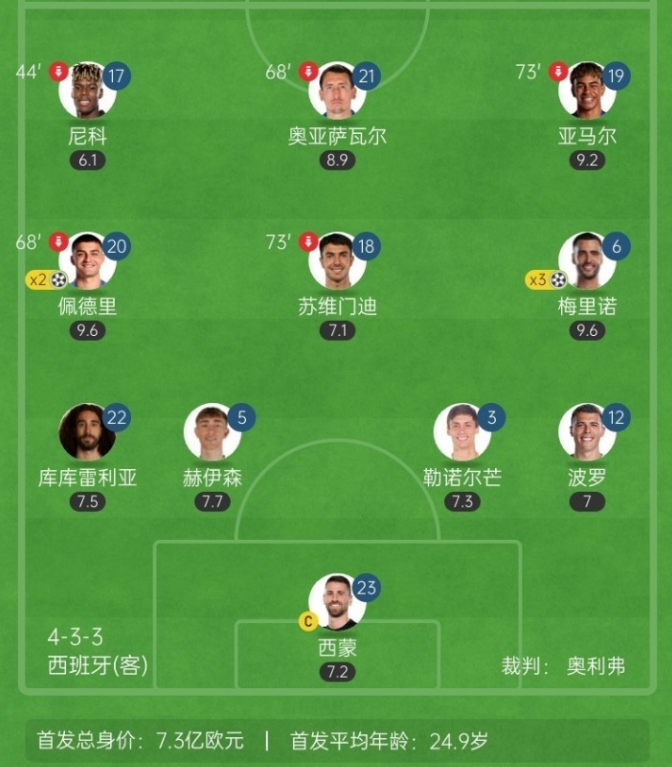 西班牙的首发11人4人来自英超,7人来自西甲。其中皇萨3人分别是赫伊森、佩德里和亚马尔。若是算上替补席的话,皇萨还有5人:卡瓦哈尔、库巴西、费尔明、奥尔莫、费兰-托雷斯