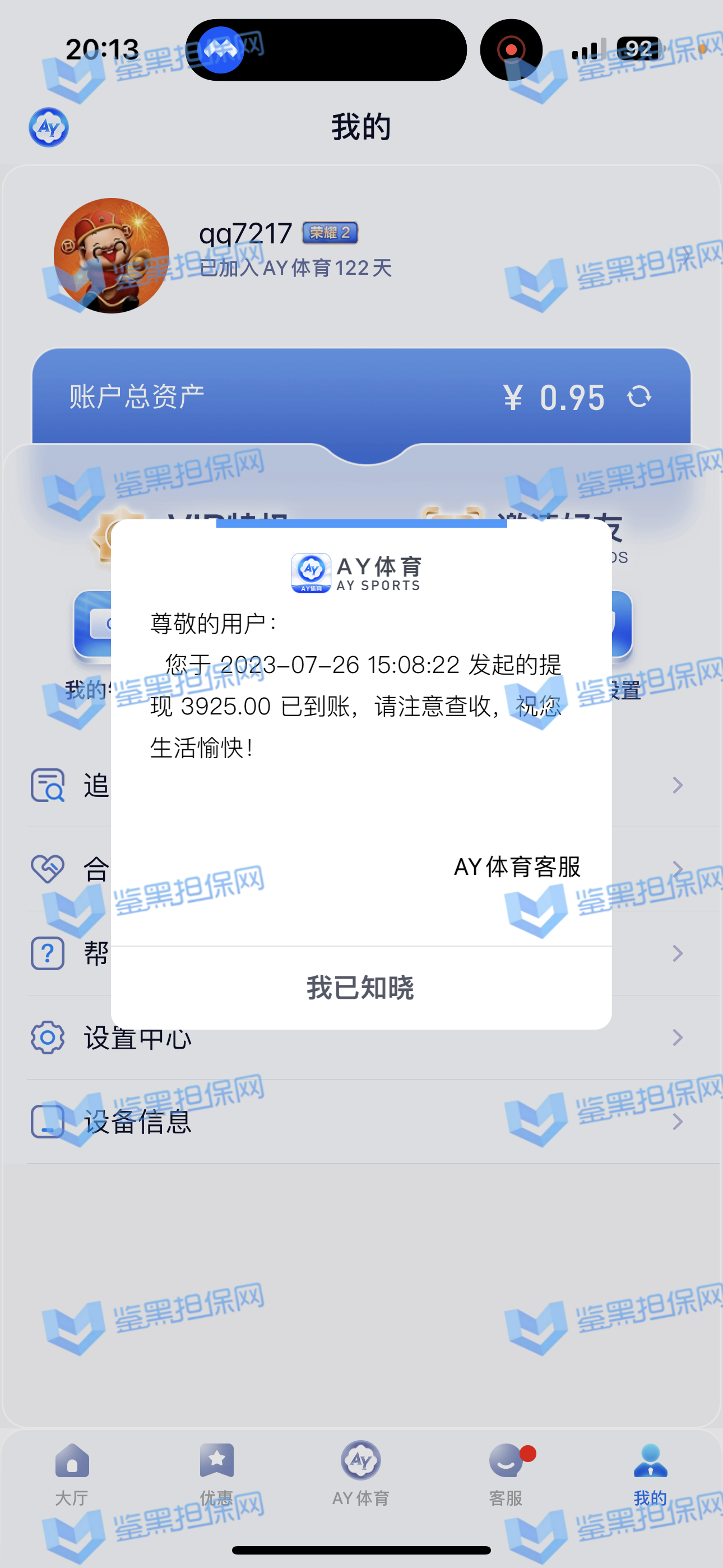 今天下午2点我在ay体育充值300 到3点08提现3925 到8点都没有看到到账 后面问客服 之前玩正常到账 今天提现说我多账号ip提现只退本金 盈利全部都没有处理 只退本金回来 都是正常充值 本人没有任何的违规 提现的是3925 只到账300 客服说只给回本金